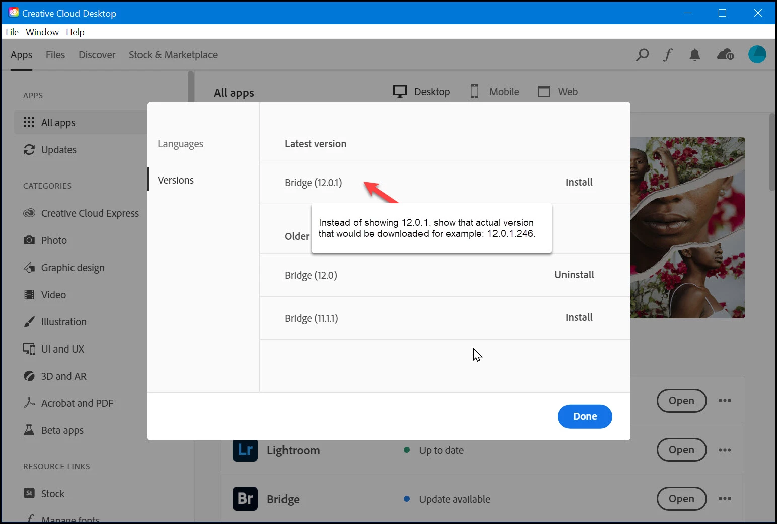 Instead of showing Bridge (12.0.1), show the full version/build number that would be downloaded.