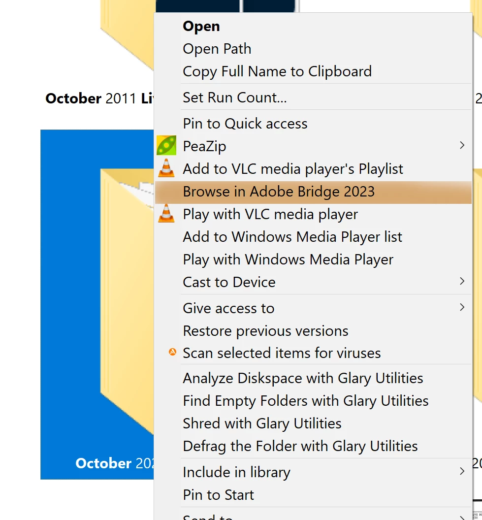 Hi, since the latest October 2022 Bridge update, the "Browse in Bridge 2003" no longer works as it used to, when I right click on a Windows 10 folder. It will only return to my previously opened Bridge without opening the new folder. It only works if I shut down Bridge and then right click, but that defeats its purpose. Windows obviously recognises the update, hence the "Bridge 2023". I have no previous versions on my system.