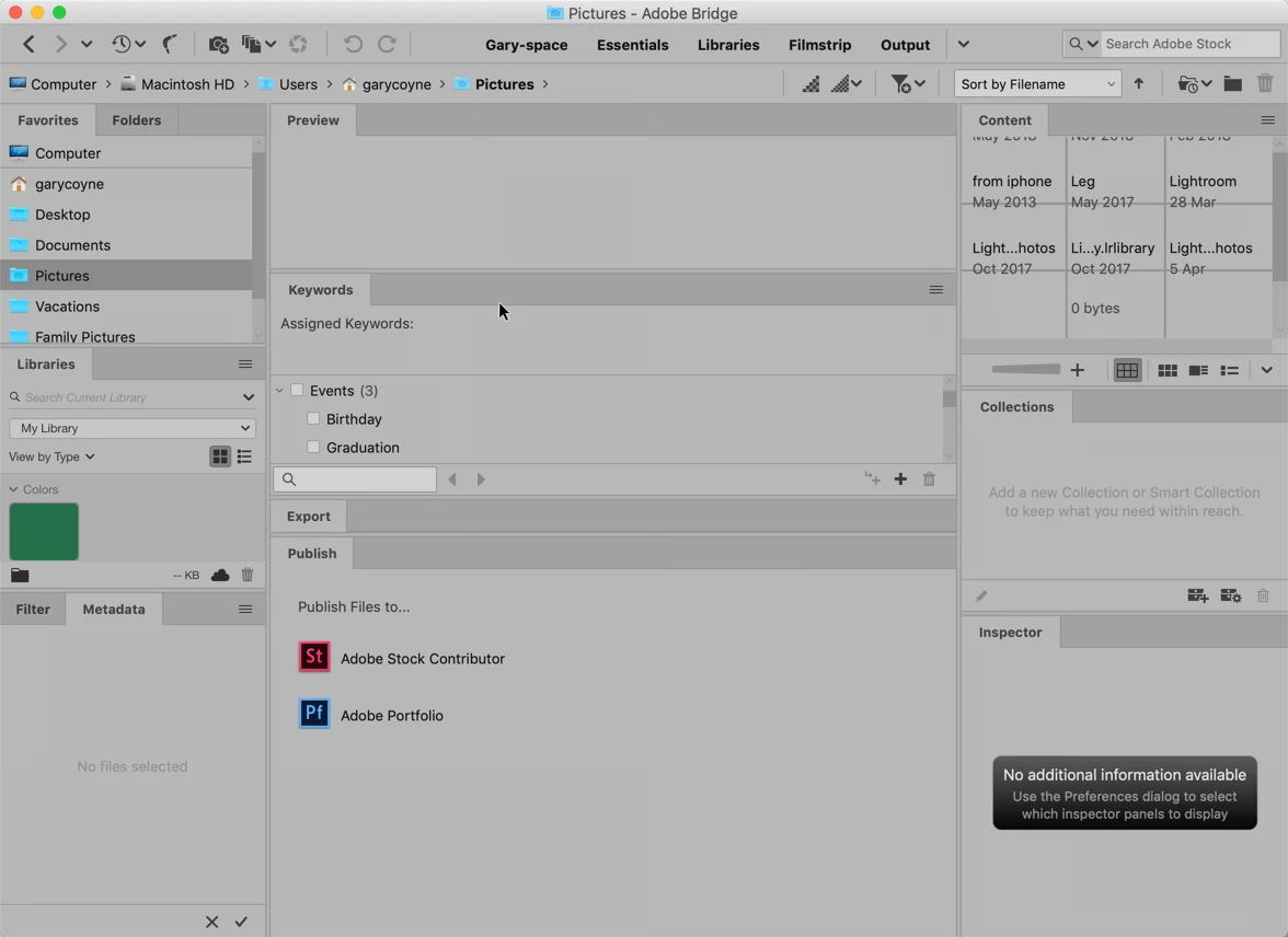 I would like to split all three columns in Bridge. The maximum number of open panels seems to be 5. Is there a way to display 6 open panels? I would like to use something like the "Filmstrip" workspace, but I would like to split the panel space on the right, the way the space is split in the middle and on the left. None of the default workspace options have all three columns of panels split.