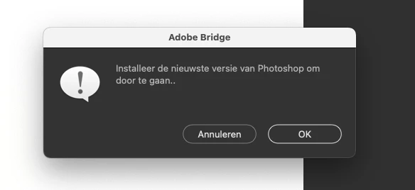 The message which appears ( in Bridge ) says: ' to continue, install the latest version' ... which I did. Reboot (computer + photoshop) doesn't help.