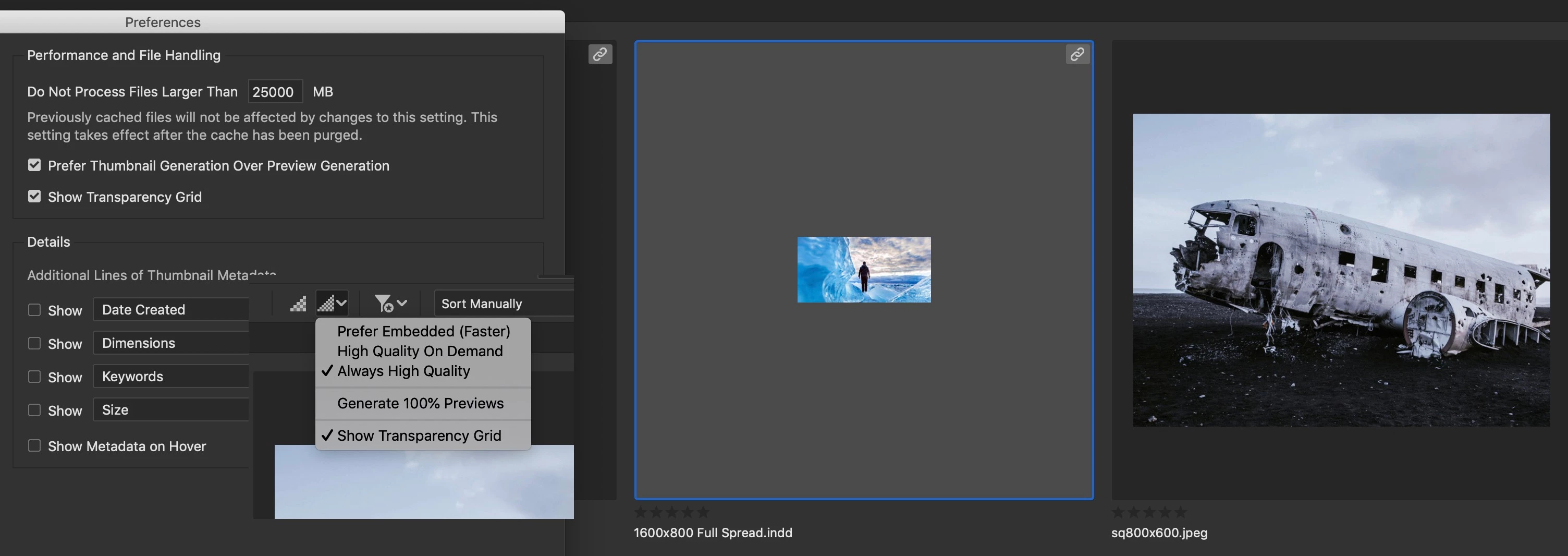 The center picture is a Indesign file but will not fill the window like the jpg to the right. No matter how I resize the previews are small thumbnails. I also purged the cache after every change.