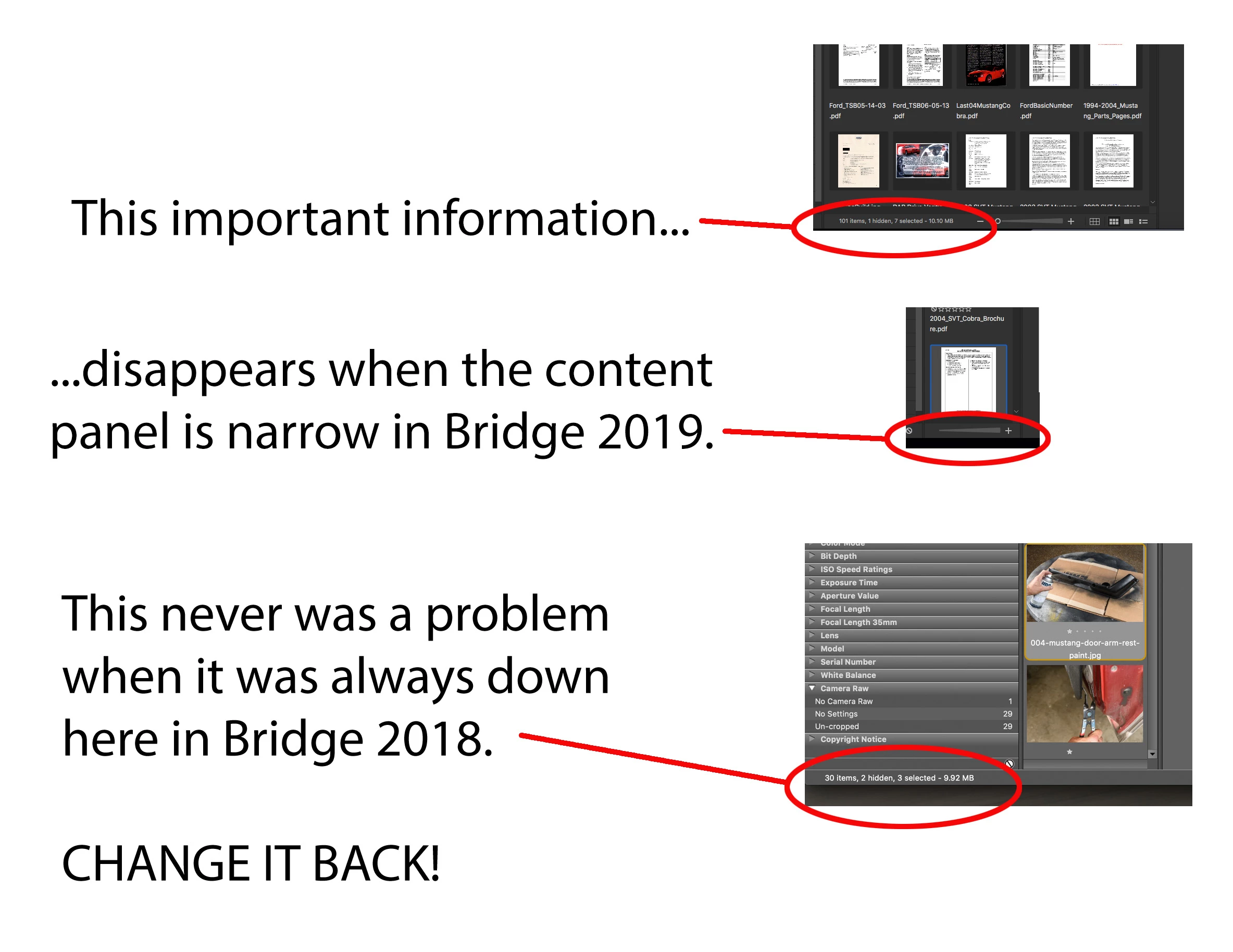 When in the "Preview" workspace, the vital information on the bottom of the Content panel is lost. In Bridge 2018, this was permanently along the bottom of the whole Bridge program window. Now that it's INSIDE the Content panel, the file number count, etc, is lost because the Content panel is too narrow to display it. C'mon. Why move it? It was perfect where it was! Or at the very least, make the file count stay, and the thumbnail size slider disappear. I often use the file count when filtering images by rating, etc. I have no idea why this was moved.