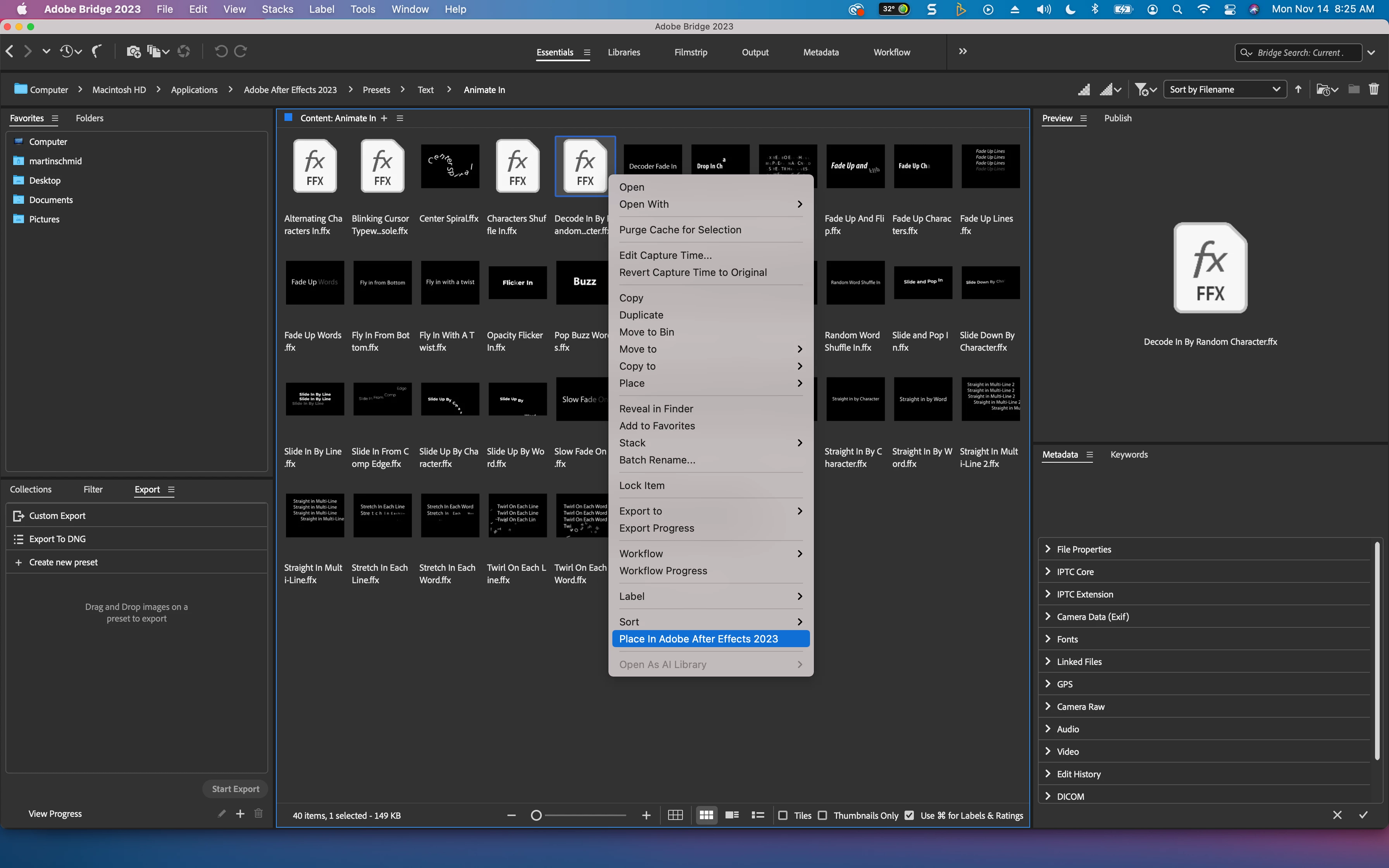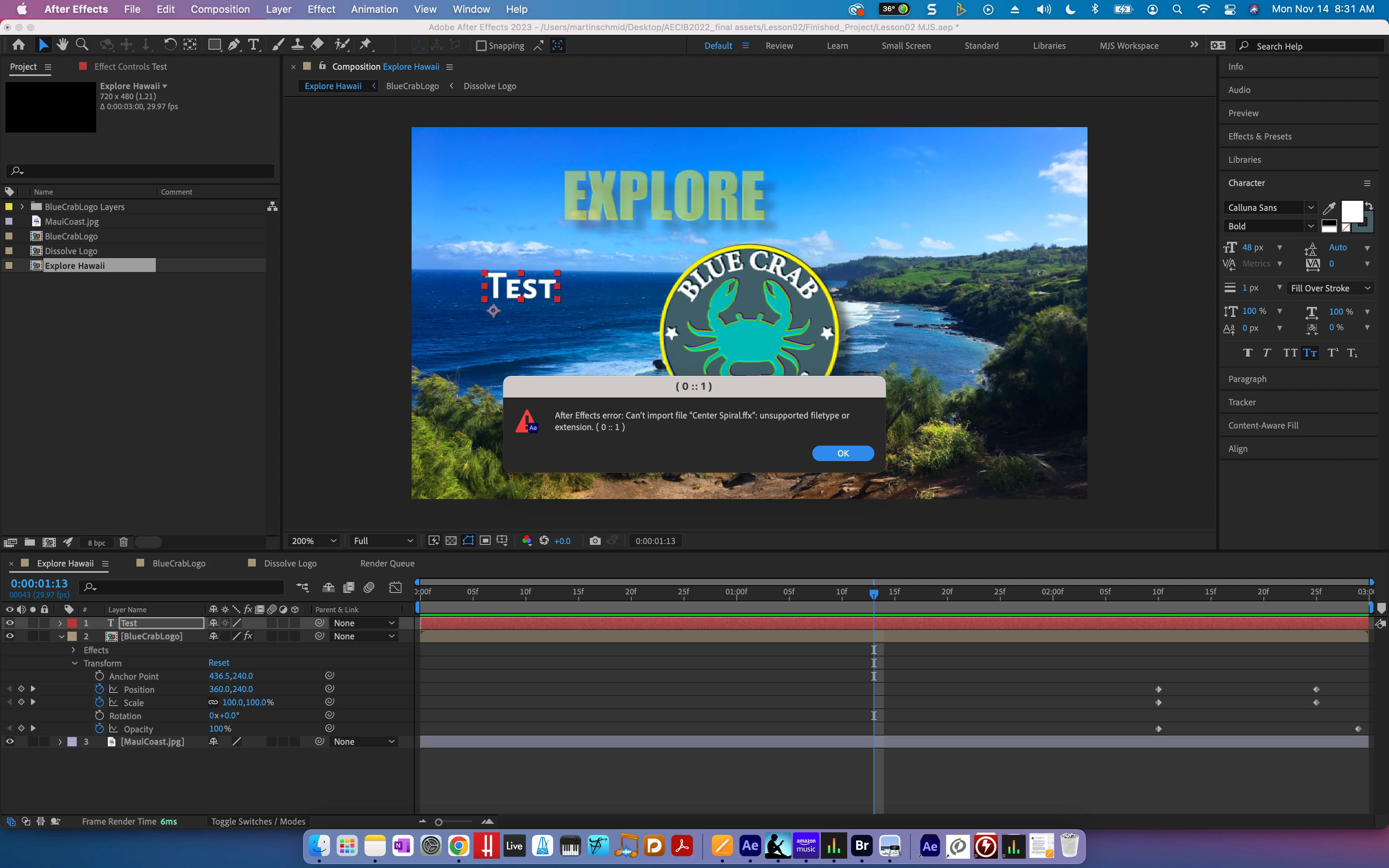 2. double-clicking an animation preset results in an error message in AE... I found i can right-click to select "Place in After Effects".. but that's not what the reference I am learning from instructed.. did behavior change? is something messed up w/ my install? Happens whether I have characters selected (text.png) or the text layer selected (layer.png).