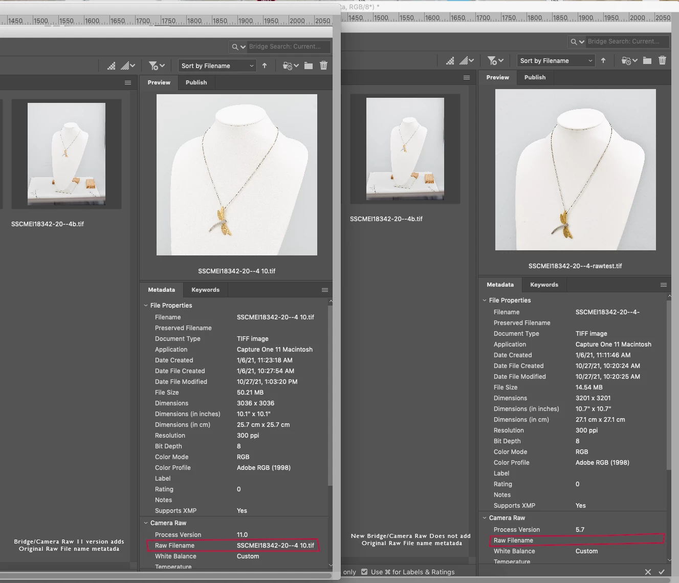 New Camera Raw is not writing Metadata, especially for the Raw Filename... the older version CameraRaw_11_4_1 for Mac was still working and works with Bridge 2020... Now with new 2021 Bridge and updated Camera Raw 14, it is not writing the metadata for Raw filename... Is there a fix to use newer versions and still writes the metadata? i have tried all versions and it seems Camera Raw 11 or older works