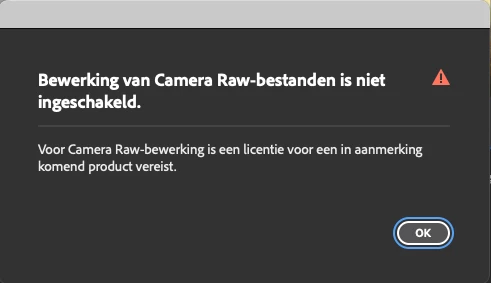 Ale ik een Foto wil openmaken om hem te bewerken Camera Raw via Bridge komt hij met een mededeling van : voor Camara Raw-bewerking is een licentie voor een in aanmerking komend product vereist.