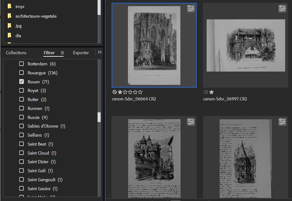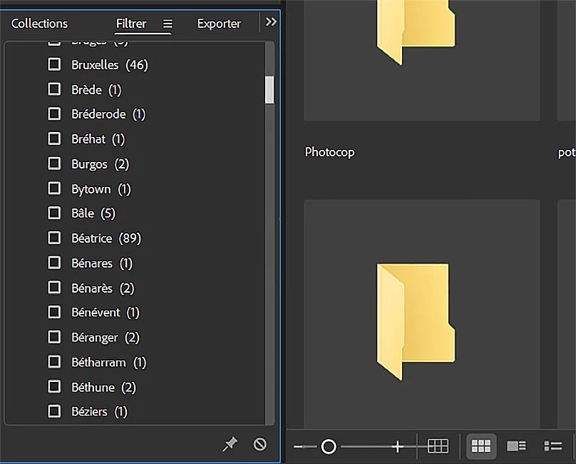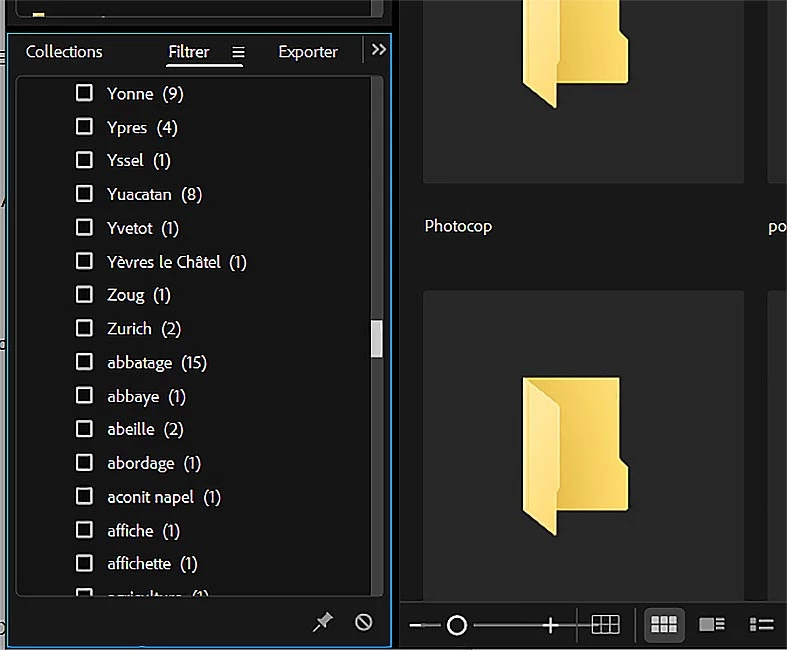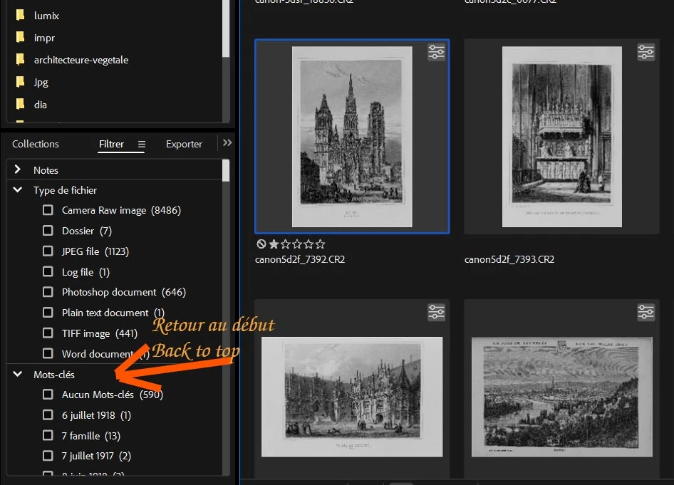 Lorsque l'on sélectionne un motclé, pour visualiser lesphotos correspondantes, et que l'on passe en plein format sur l'une d'elle (touche Espace) lorsque l'on revient en vue avec vignettes la liste des motsclés se reposoitionne au début - il faut alors rechercher dans la liste le mot coché, pour le décocher - pénible !