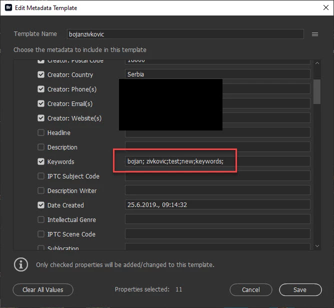 If I try to add Keyword1 and Keyword2 in a metadata template, they will show up as "Keywork1; Keyword2" instead of keyword1; keyword2, once added to a file.