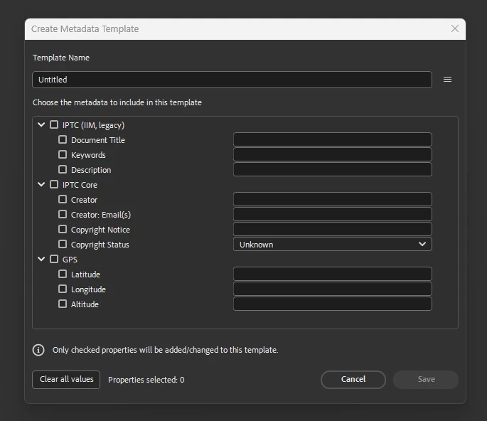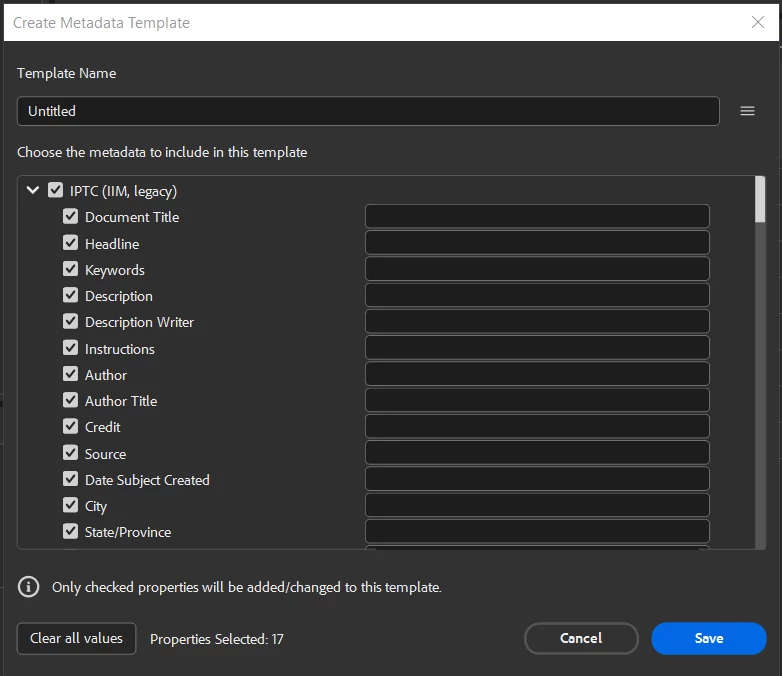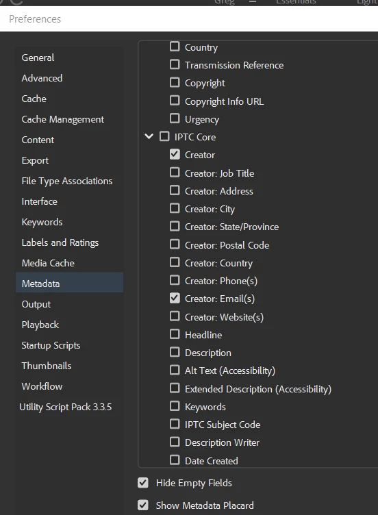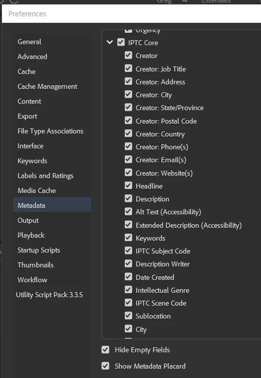 The very properties of the IPTC Core section I wish to edit (mainly contact details) are not listed.