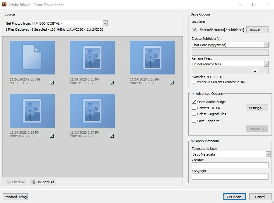 So, I've recently switched cameras, I've changed from Nikon D800 to Canon EOS R and now when I am about to transfer pictures from my card to my PC via Bridge, when I click ''Get photos from camera'' standard Photo Downloader window apeears, and then when I click Advanced Dialog to see whitch photo I want to download I dont see my pictures as you can see in the attachment. But when I open the same photos from Bridge directly on my SD card, all photos are fine, I see them perfectly. Does anyone knows what is the problem and how to fix it, because I ofter you this metod to transfer my photos. Thanks in advance. 🙂