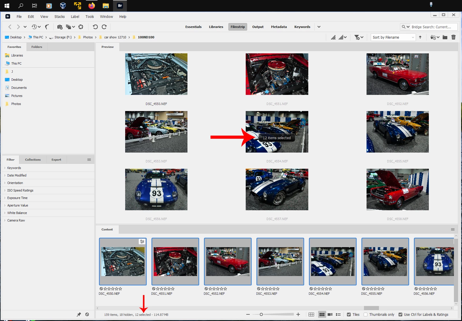 In Bridge, in Filmstrip view, if I have 20 RAW image files and I select 10 files, is there anywhere that shows that 10 image files have been selected (other than having to add up the total in the Filter tab)? The only time I see a total number of images and selected images is in Essentials view at the bottom. Thanks for any help.