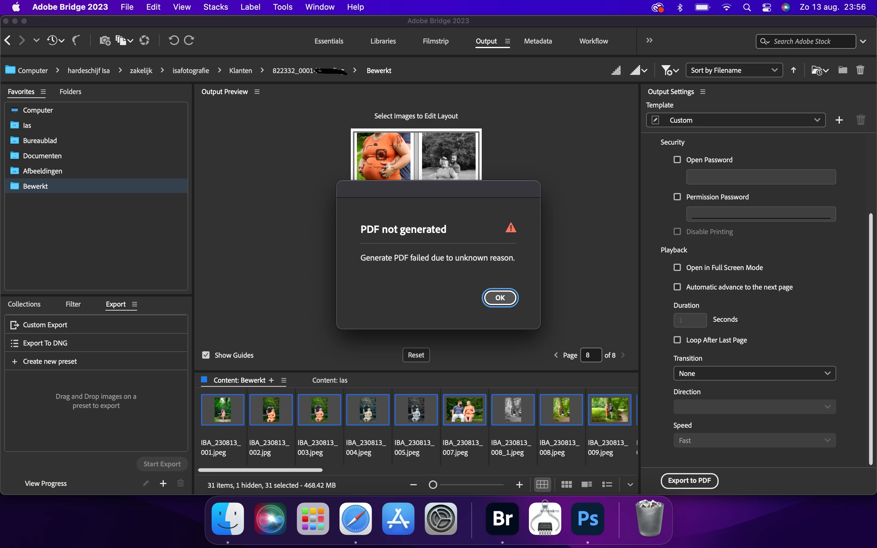 Hi, I keep getting a pop-up when I want to export a PDF file with pictures from Bridge. It wont export, I've tried different computers. Does anyone know what I can do about this.