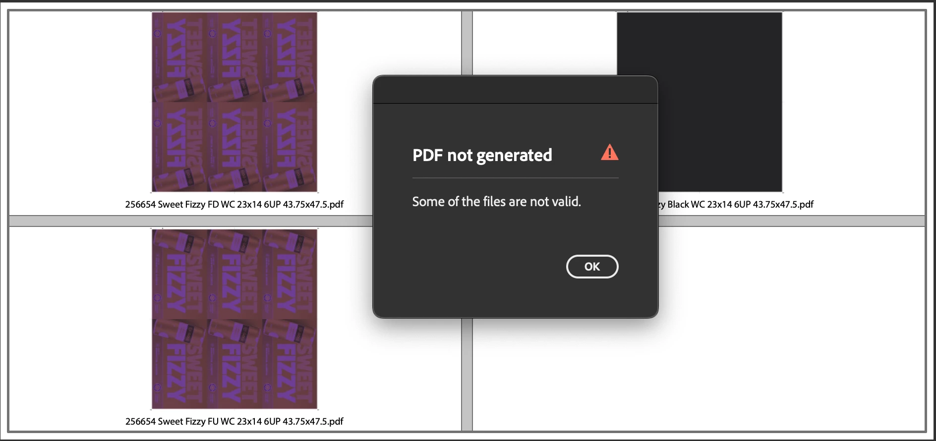 I reliably get this error message on some file types. The files I am trying to get a PDF image of are themselves PDFS and I have them set to Overprint a "Spot White" Coloured Purple for my RIP Software and the printer we send it to.