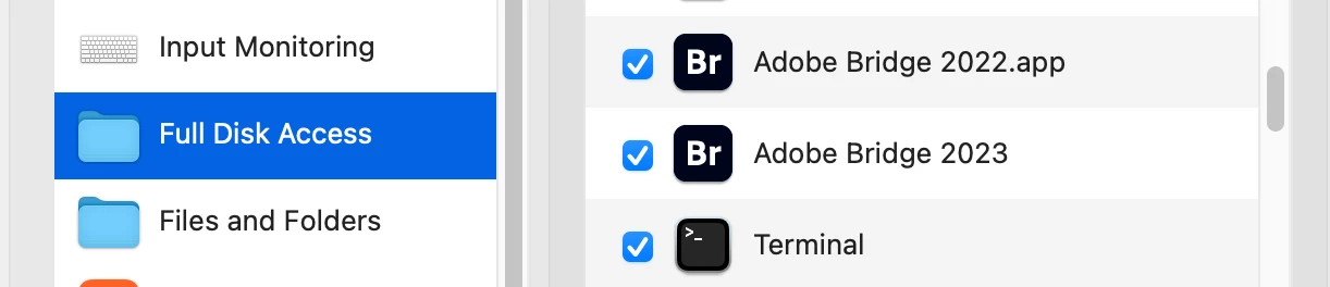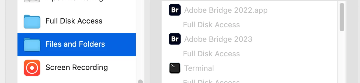 [Note: if you are using Ventura, the look of this has changed. But what I show below is sufficient for you to figure out what you need to do.] Go to your System Preferences and select Security and Privacy (found in the top section). Now click on the Privacy setting (last tab). Now click on the lock on the bottom left and provide your Administrator code. Now select the Full Disk Access option and click on the "+" symbol. This will bring up the standard Mac Open window and let you add any application you want or need to have full access. Look for Bridge, and select it; it will now appear in that window, and make sure it's checked. Next, go to the Files and Folders option and do the same thing as above (although there's nothing to check, just add. Close everything down and see if that makes it all work.