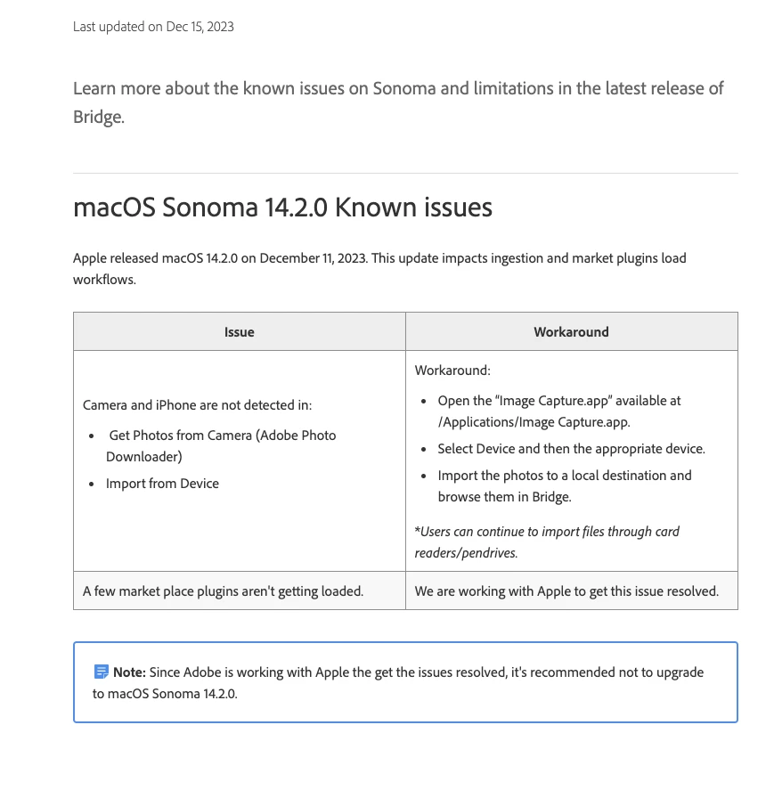 Photo Downloader does not detect Camera or iPhone. ( Bridge 14.1, updated, Sonoma 14.2)