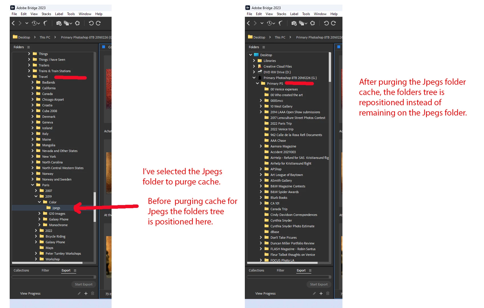 If I select a folder from the Folders panel in Bridge ver 13.0.0.0562 and then select Purge Cache from the Tools menu, the cache will clear but the folders displayed in the Folders panel will start at the top instead of staying on the folder I selected.