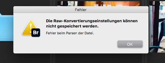 when I work on an image file like a jpeg in Camera RAW via Bridge the presets are not saved with the image anymore – the small bullet-list icon in the top righthand corner is missing. Instead I get an error window saying «RAW conversion settings cannot be savec – parsing error», see screenshot.
