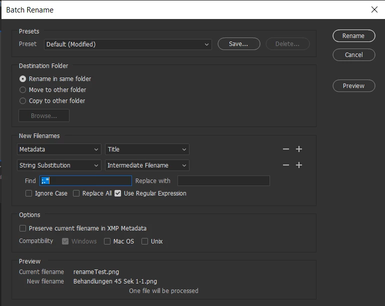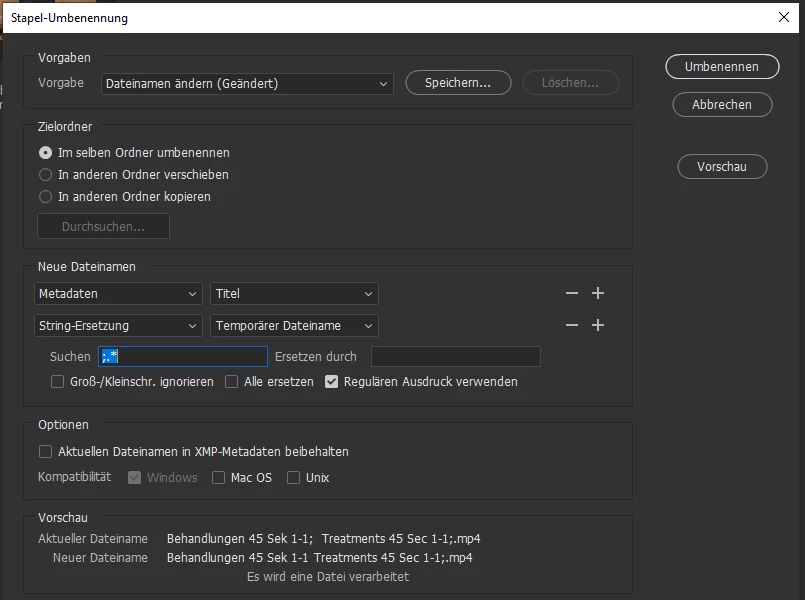 The only difference is that in your screenshot, the current filename is Behandlungen 45 Sek 1:1; Treatments 45 Sec 1:1;.mp4 Is that really the original filename or is it an aboration of the batch rename tool? I wouldn't think it's possible to have that filename in Windows.