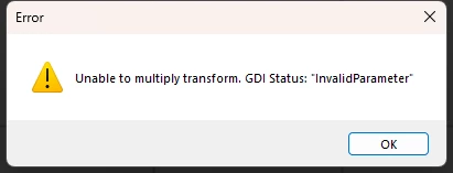 "Unable to multiply transform. GDI Status: "InvalidParameter".