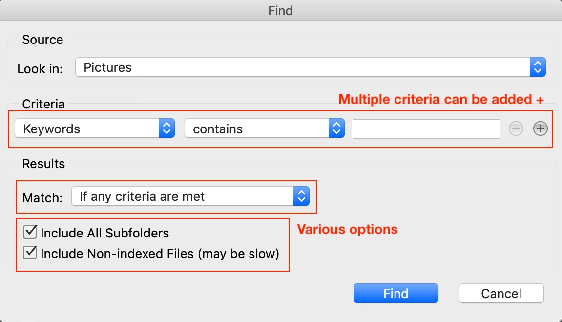 I added a keyword to some files. Now I want to find the files that contain that keyword. Is there a way of doing this without opening all my folders and subfolders?