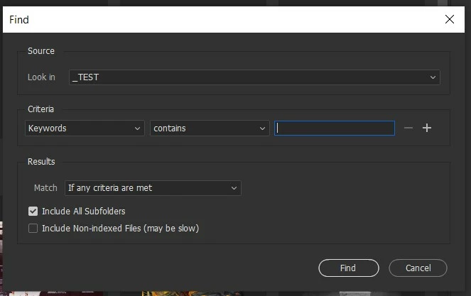 I use Bridge as the file manager for all my thousands of photos and finding folders by name is not a problem. But I recently realised that there is an option to add tags to every photo when saving it in Photoshop. So I have trialled this with the contents of a few recent folders, assuming that then there would be some kind of search engine in Bridge which would allow me to find the relevant photos of e.g. my stepson regardless of what folder he might be in by looking for his name. But I can find no such way of searching and thus I am wondering what is the point of the tags option when saving a photo? Am I missing something or is the only way to set up searching at this granular level to use the Keywords Panel in Bridge? It doesn't make sense to me for Photoshop seemingly to offer something that has no user value.