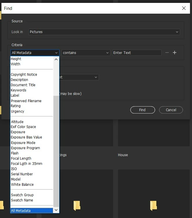 I am on release 12.0.2.252 - I don't see an All Metadata option from the Criteria dropdown - it starts with Filename and finishes with Swatch Name.