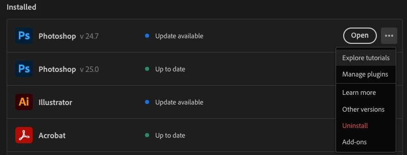 Perfect timing, today I have 2 versions of PS installed and need to remove the old version. Go into your Creative Cloud app and click on the ... next to the open button to uninstall.