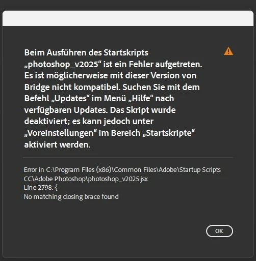 seit dem letzten Update der Bridge kommt immer wieder die Meldung, dass Scripte zu aktivieren sind, siehe Anlage. Doch diese in den Voreinstellungen in der Bridge zu aktivieren hält leider nicht. Zudem klappt das PLatzieren in Photoshop nicht mehr. Ich habe die neuesten Updates installiert, sowohl bei Photoshop alsa auch bei Photoshop Beta Version 26.6.0