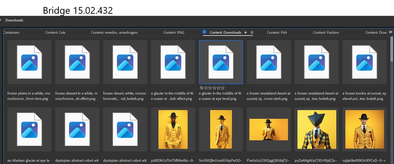 This is reproducible on two independent computers running different OS versions Win10/Win11. None of the bridge versions display the PNG thumbnails. The PNG files open fine in any PS version.