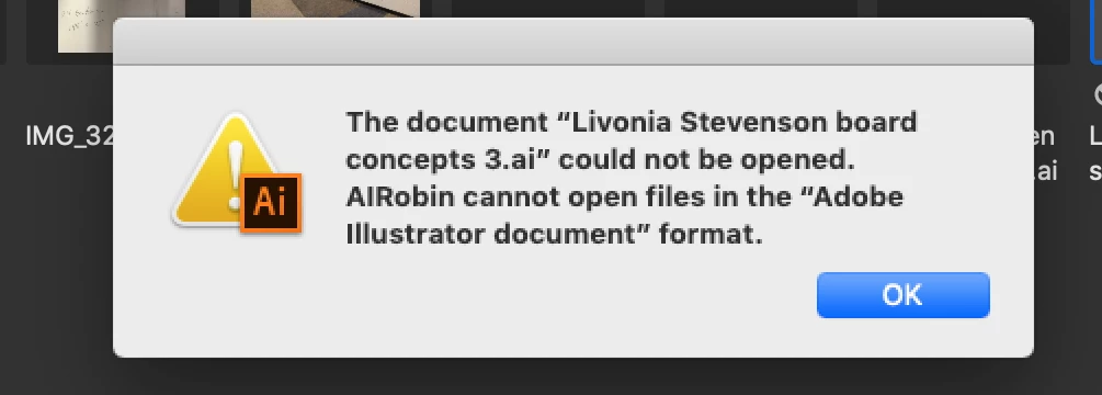 The document....could not be opened. AlRobin cannot open files in the 'Adobe Illustrator Document' format.