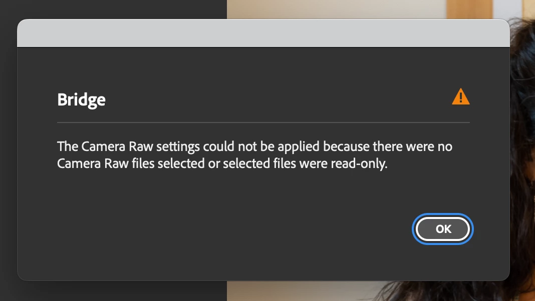 The Camera Raw settings could not be applied because there were no Camera Raw files or selected fil