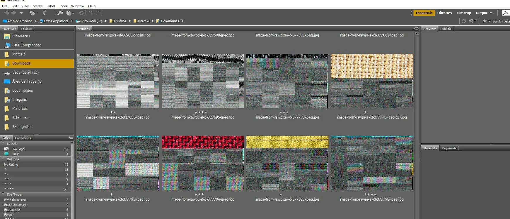 Okay, I installed all of the cc2019 updates and Bridge (worked normally on cc2018) started to behave crazy. I mean all works except preview thumbnails. I get some kind of "static interference" pattern instead of previews.