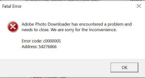 I have been using Adobe bridge to uploade pitctures from camera, but now get error. Adobe photo download encountered an error. Any ideas please