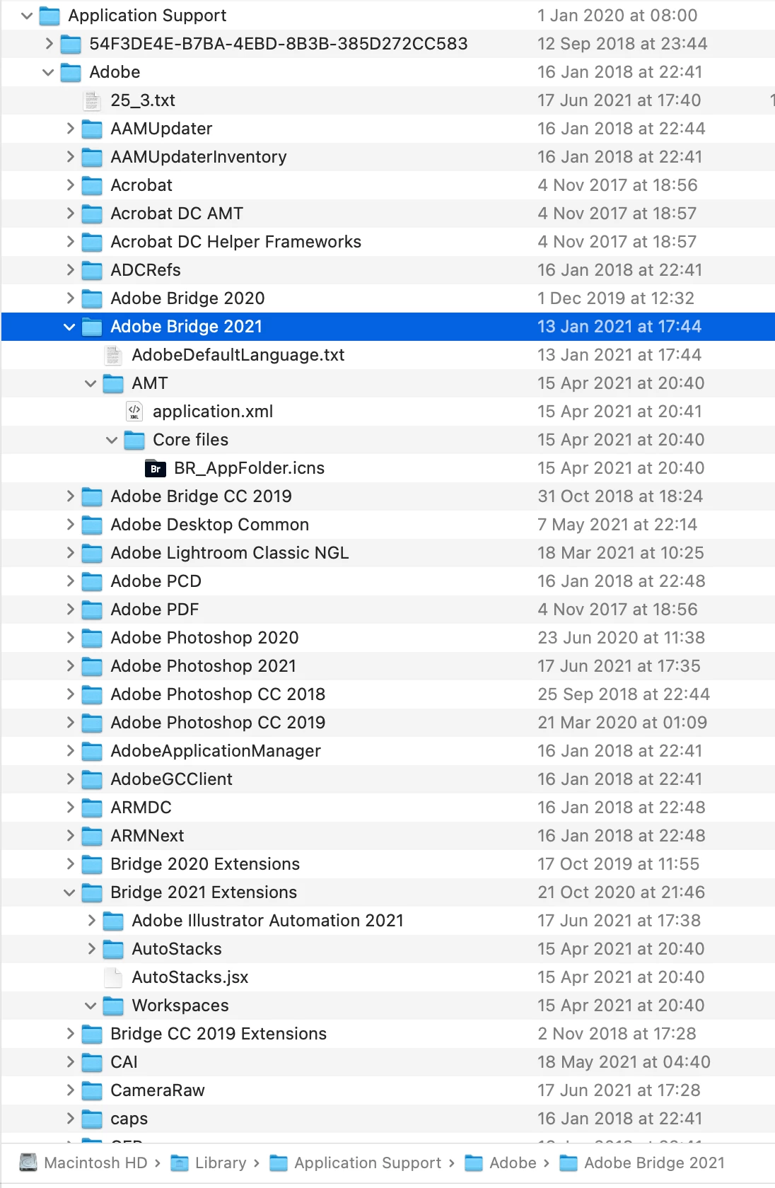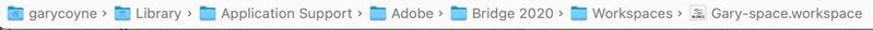 I am trying to locate Workspaces in Finder for my saved workspaces from Bridge 2021 on my Mac. I can find where to place them on my new iMac, but the location is not the same on my existing Mac. I would like to copy over my workspace setups rather than re-create them fresh. I have looked in Library/Application Support/Adobe/Adobe Bridge 2021, and also in Library/Application Support/Adobe/Bridge 2021 Extensions/Workspaces. Nothing in any of these locations - even though I can place a previously saved worskspace to this latter location