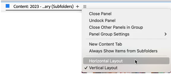 Hi, @excited_Whirlwind0660, sorry, you are pointing at the wrong hamburger menu. Point to the one IN the Content panel next to the name of the folder you are looking at. Here, I'm pointing at the folder called Mount Wilson. To the right is the hamburger menu that you need.