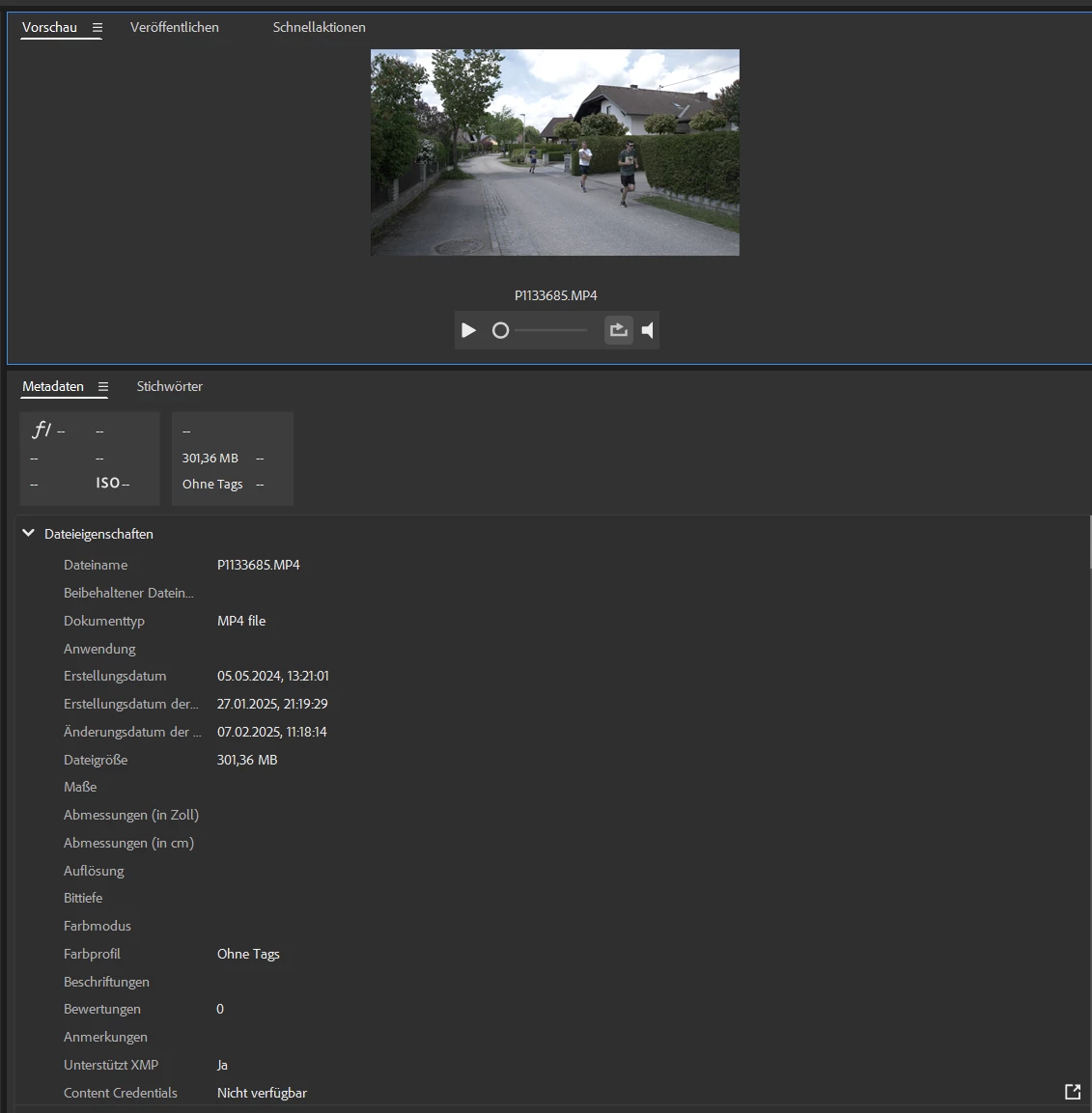 When selecting a Video File, it doesn't show the XMP Metadata, which comes with the File. It only shows some Dates, the size and the Filename: