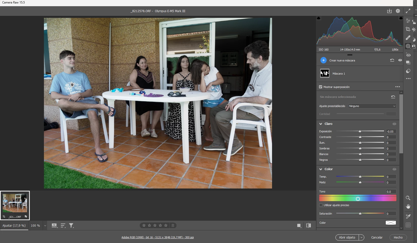 para el mismo archivo. Según lo que veía en la miniatura deduje que lo que estaba seleccionado eran los sujetos. Esto es lo que quería. A través de las opcione de esa máscara selecioné invertir, pues me interasaba editar el fondo separadamente, desaturándolo, etc. Los sujetos en pantalla aparecieron con colores tenues y en color natural el fondo. Intenté desaturarlo y no pasó nada, ni en los sujetos ni en el fondo. Comprobé con otros ajustes y tampoco. Por otras veces sé cómo acabar saliendo de la situación pero acabo teniendo que volver a empezar. la pantalla estaba así: