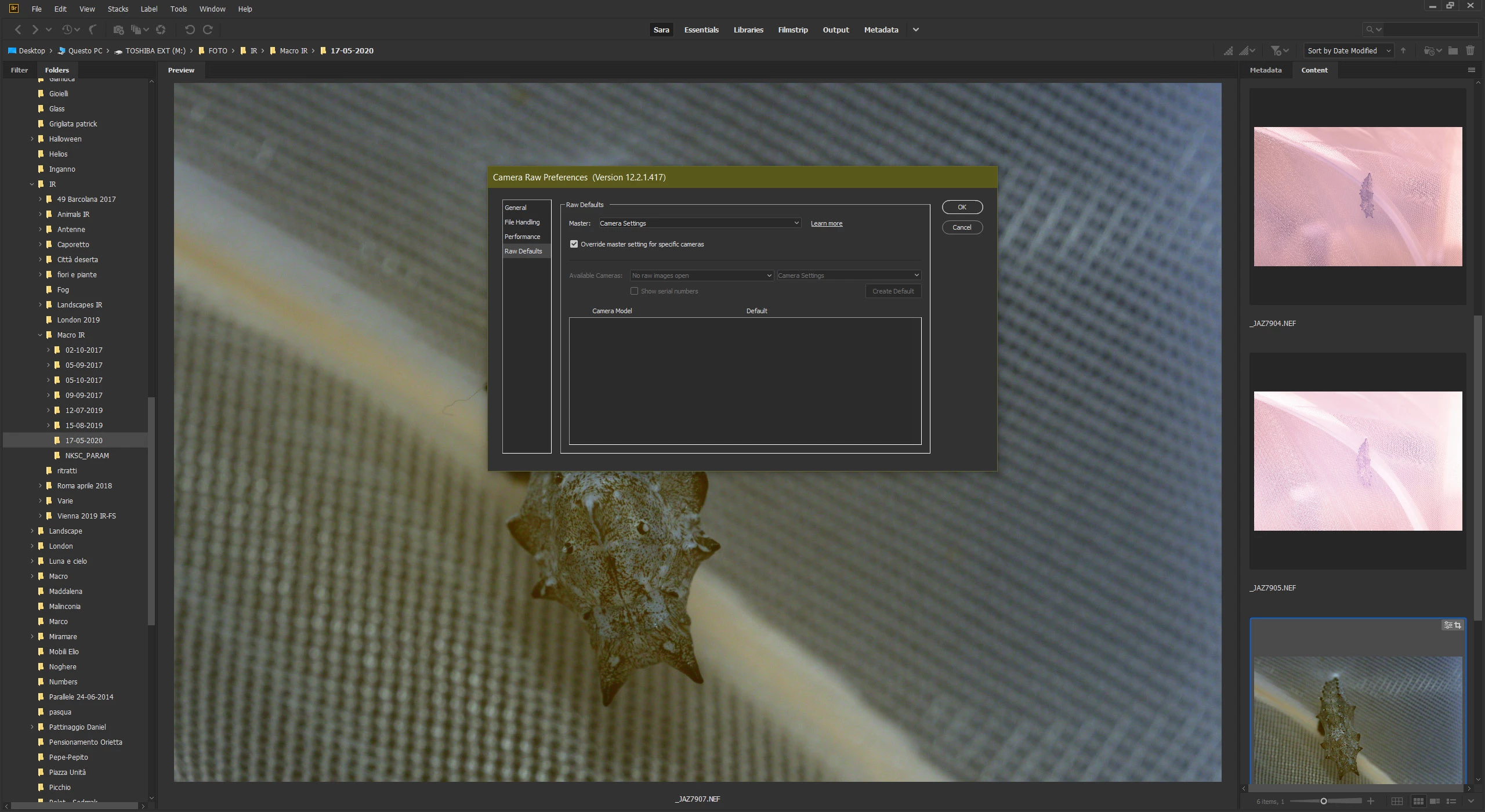 Hi, I created a camera profile to apply to all my infrared images taken with my Nikon D600. I used to be able to apply this profile to all images taken with that camera automatically. Before uninstalling and installing again (due to an issue with creative cloud) I achieved this through the camera raw settings. Now I go to the ACR settings and to RAW defaults and all the lower part where you should be able to select a camera model is grey. Even if I check "override master setting for specific cameras" everything is unselectable. I run Windows 10, latest update for all Adobe apps