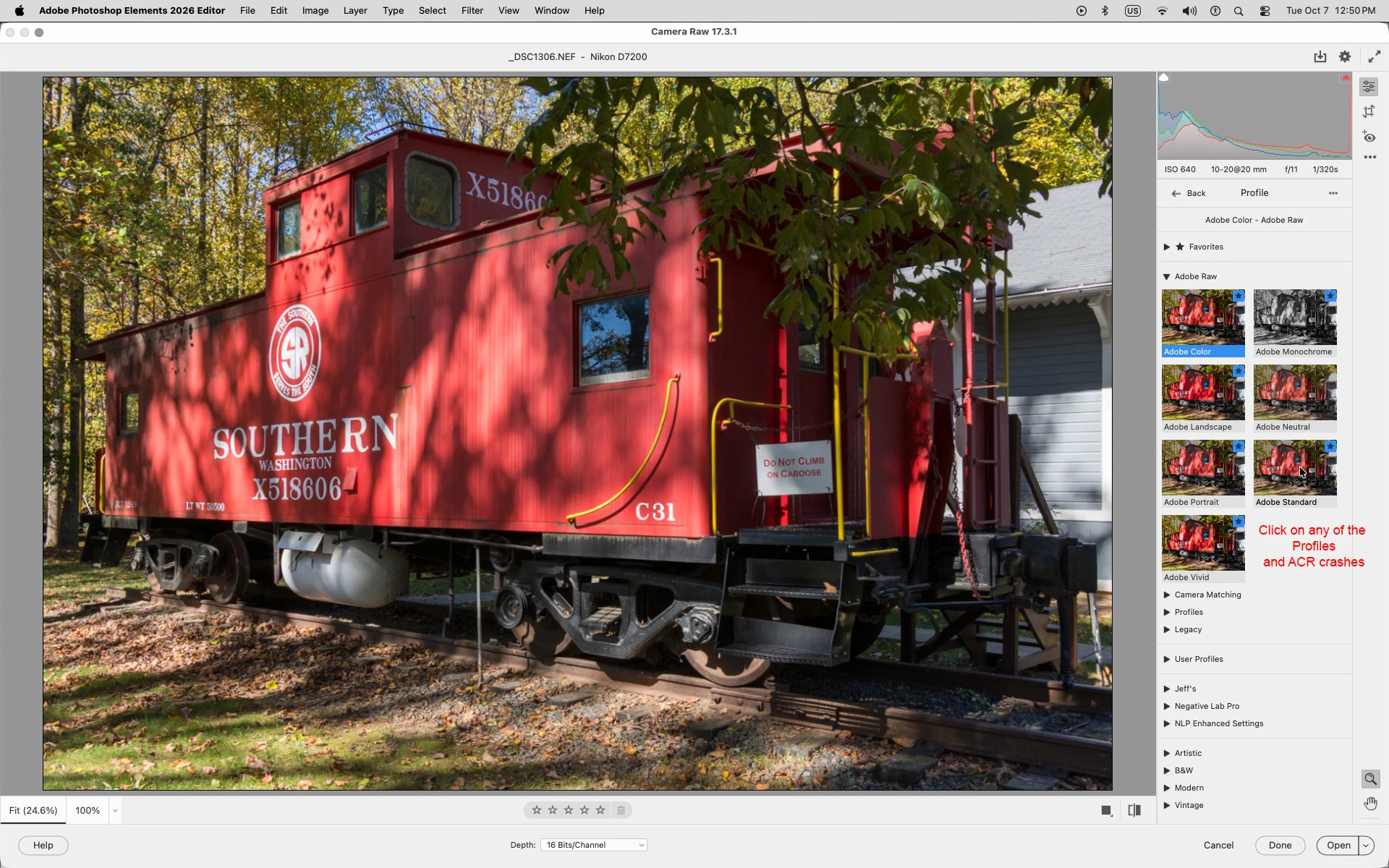 On the Mac side, when using the Adobe Photoshop Elements 2026 Editor and the installed Camera Raw 17.3.1 using Help>Install Camera Raw, if you open Camera Raw click on Browse Profiles, then click on any of the available profiles, both Camera Raw and the Photoshop Elements 2026 Editor immediately crash