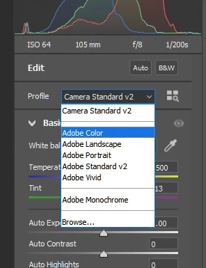 This may be specific to Nikon cameras, and I'll mention that I am running ACR on a Windows 10 platform. There is the ability to use profiles that match the camera profiles, and by setting preferences in ACR accordingly they can be used in addition to the Adobe profiles. The attached file "ACRSetupRawDefault" shows how I believe this is done. Then, after ACR opens a RAW file, the color profile information is displayed as shown in the attached file "ACRProfileDisplay1". Note that the selected profile is Camera Standard v2, and the drop down menu allows a variety of Adobe profiles to be selected should I prefer one of them instead of the camera profile. So far, so good. However, there is a problem in my opinion, if I decide to select one of the Adobe profiles in the drop down menu. Once I do that, as shown in "ACRProfileDisplay2", the Camera Standard v2 has disappeared and is no longer available as a selection because it is not included in the drop down menu. The only way to go back to any camera profile is to click on the four-square icon to the right of the window showing the current profile, and do a confusing search past a number of profiles to find it. To me, this is a bug. The default camera profile should be included in the drop-down menu. Any one have a comment on this? I thought I had submitted a bug report to Adobe about this a while ago but cannot find it in the system anywhere.