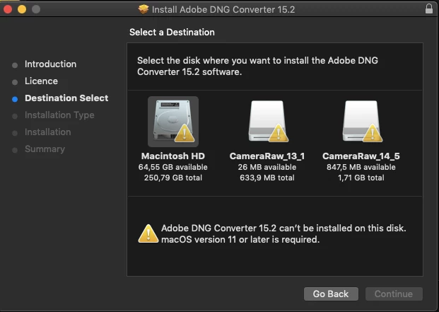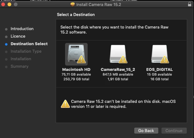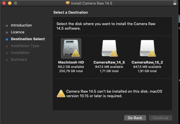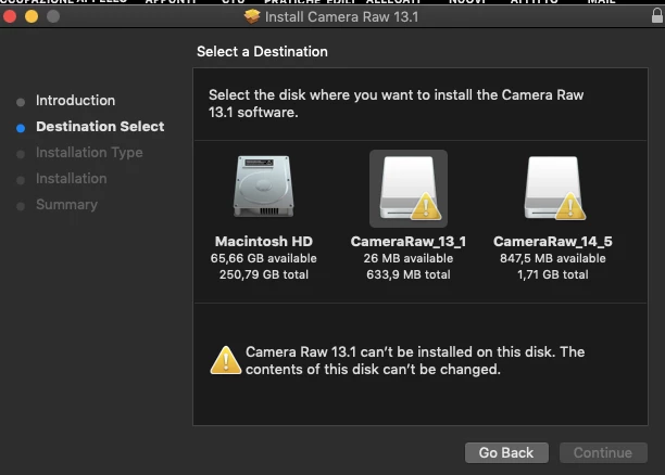 Camera Raw 15.2, 14.5, 13,1, where I am showing "can't be installed on this disk", for the first two, the content of this disk can't be changed, for the third.