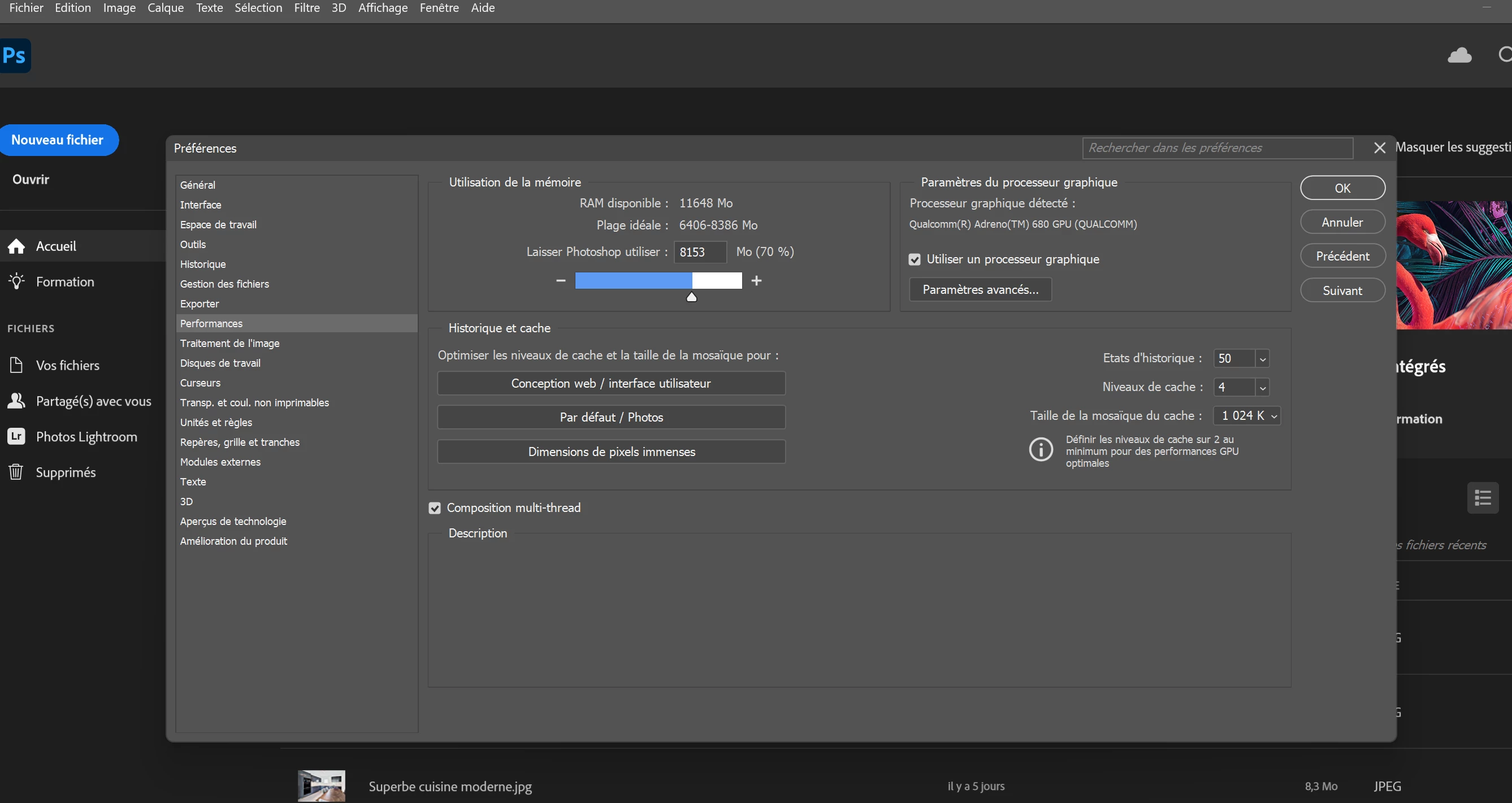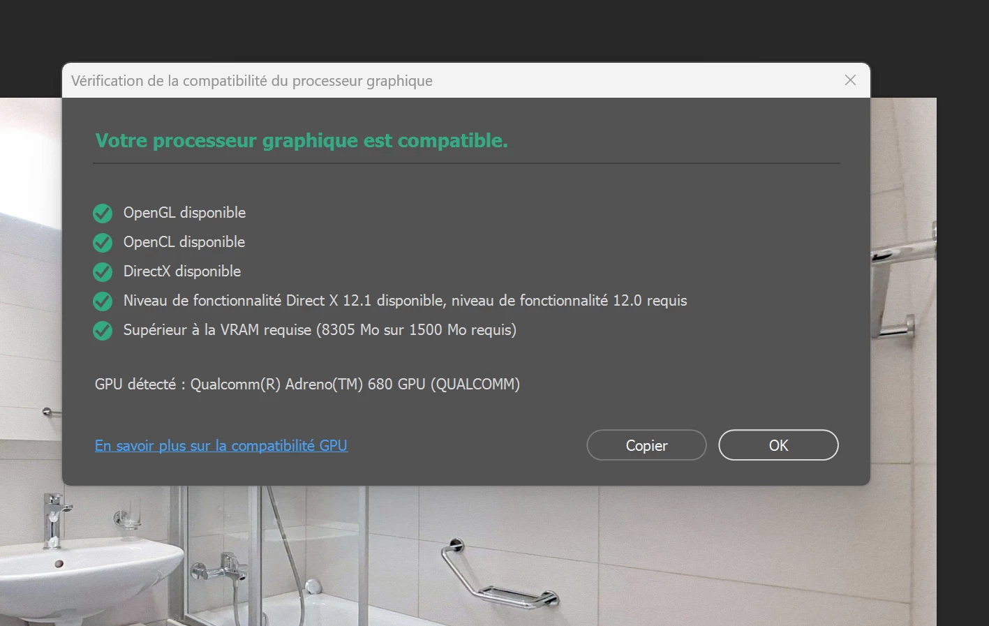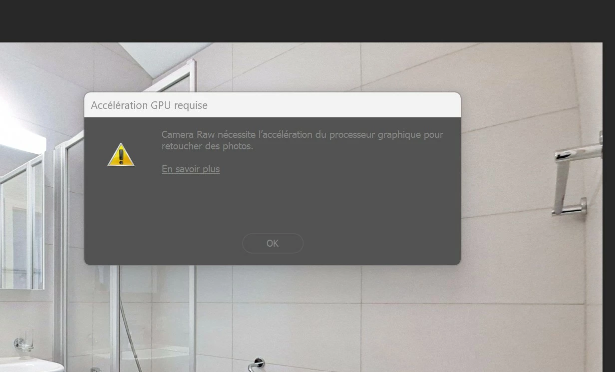 Depuis que je l'ai installé, il n'autorise plus l'ouvrerture et me donne un message d'erreur : Cammera Raw nécessite l'accélération du processeur graphique pour retoucher des photos.