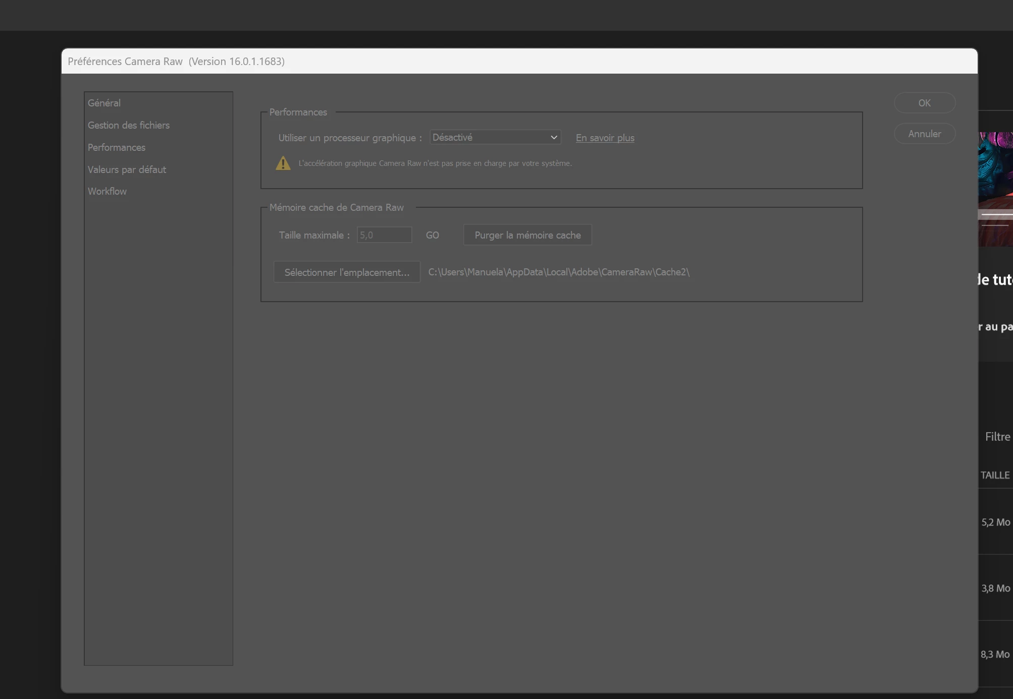 Quand je vais dans les préférences Camera Raw > performances : j'ai l'information : L'accélération graphique Camera Raw n'est pas prise en charge par votre système.