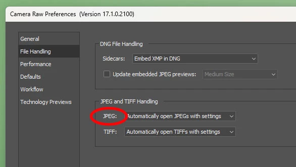 Camera Raw 17.1 preferences no longer show the File Handling > JPEG/HEIC option
