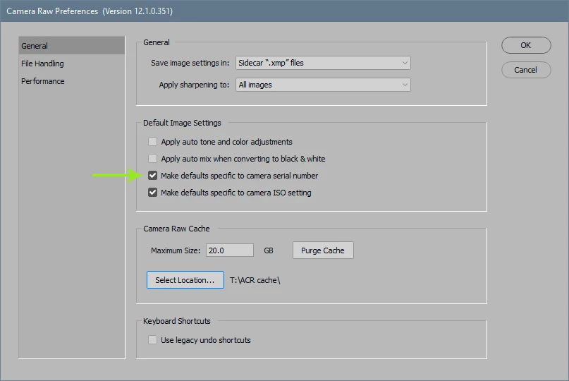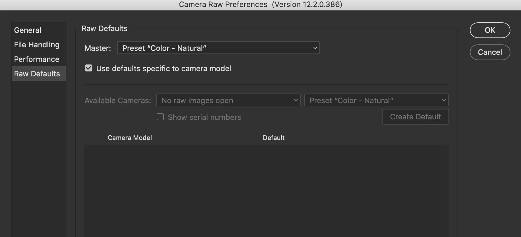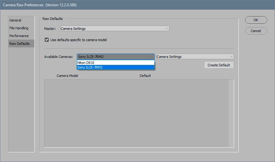 the tab to set specific camera default for raw conversion is gone in this newest version of camera raw, how do you set it for each camera body