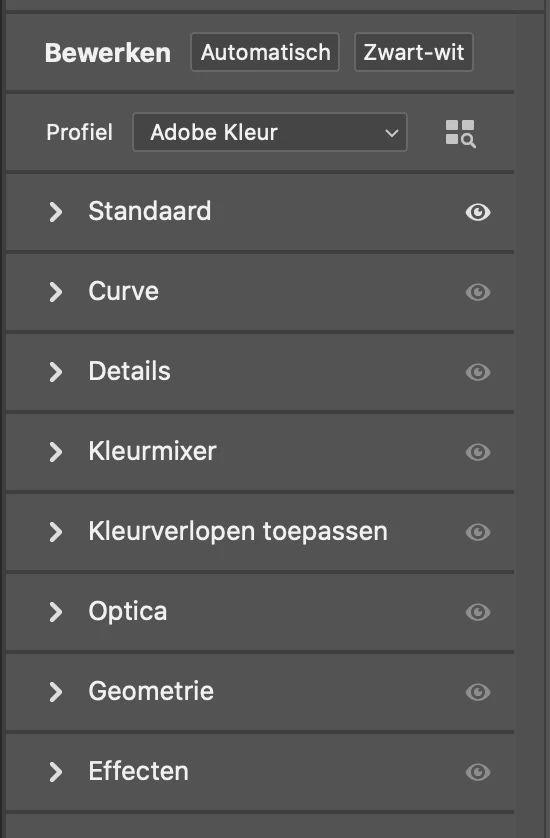 I have trouble with Camera Raw. On the right side you have all these options. However, when I close the "standard tab" and go to another tab, I can't open the standard tab anymore. I have to close Camera Raw, and open the file again to get it open. But whenever I close it again I can't open it again.