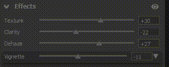 Step 4: now set "texture, clarity and dehaze" to some random values. Press & hold & release the eye icon.