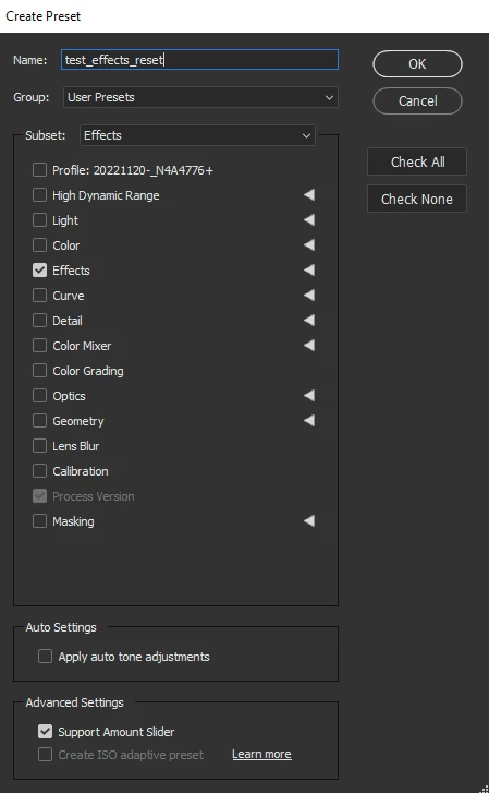 Step 2 - create a preset, name it "test_effects_reset", check only "Effects" (and possibly "Support Amount Slider", not tested with this unchecked)