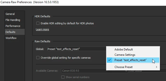Camera Raw - clicking on the eye icon in the Effects panel resets all effects settings