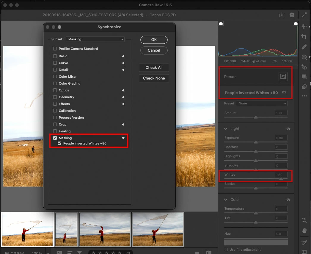 I have a very repetitive task that would be so much easier with an action. I need to select the exposure brush, create a mask using the select people function, invert the mask and then boost the white slider by +80.