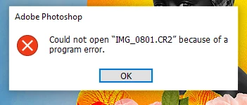 When I try to open the .CR2 file in Photoshop, it gives me the attached error. Everything else in Photoshop appears normal, and photoshop files can run fine.